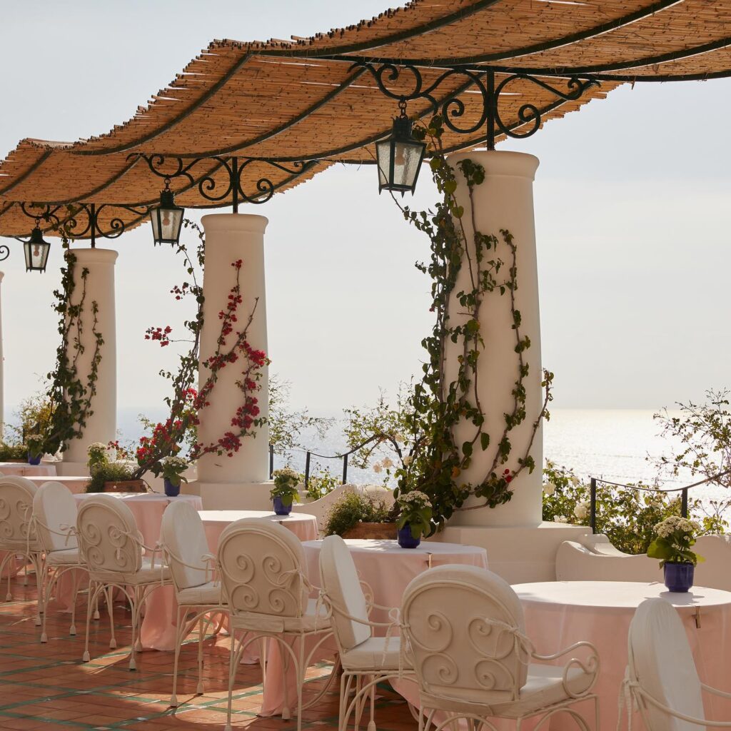 Every hour here unfolds with quiet rhythm: breakfast on the terrace overlooking the glittering sea, a swim in the emerald-tiled pool surrounded by terracotta urns and citrus trees, an afternoon spritz as the light softens over the sea. Evenings glow golden at Michelin-starred La Sponda, where hundreds of candles illuminate the vaulted dining room and the scent of Amalfi lemons drifts in from the terrace.